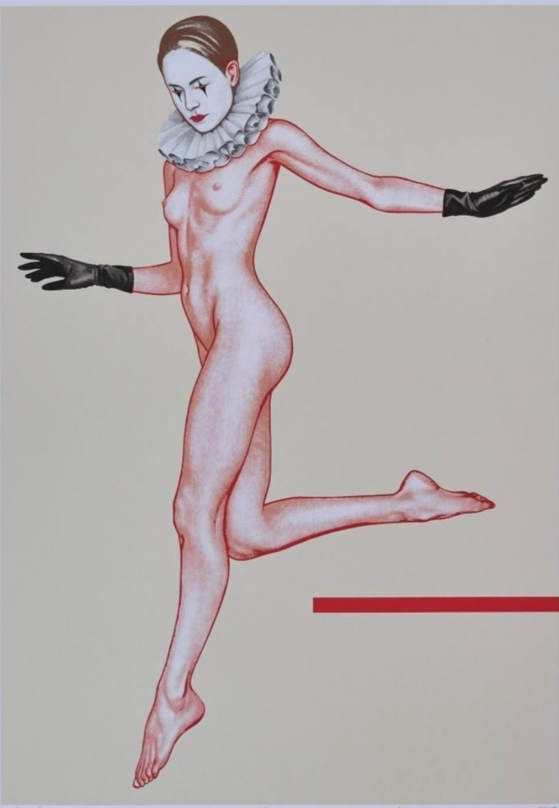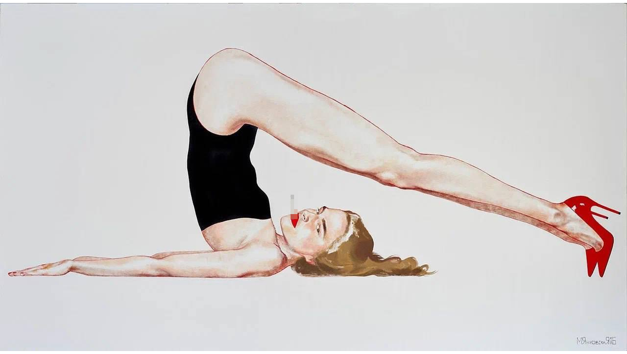 Вторая линия — женщина в переходе. Она ищет себя, экспериментирует, сбрасывает балласт старых убеждений, как змея кожу. Здесь решительность сменяется тишиной и наблюдением. На одном полотне героиня сидит в тени, потом оказывается на свету — ей уже не страшна двойственность, она купается в теплых лучах. На другом — лежит в облаках, мы видим только спину, символ абсолютной хрупкости. Яркое небо контрастирует с незащищенностью: героине не нужна броня, ей нужна пауза, чтобы вернуться к себе. Еще одна работа — «Система»: та же женщина парит над шахматной доской, над фигурами и правилами. Ей не надо торопиться, не надо выигрывать. Она одновременно внутри системы и над ней, знает все правила, но выбирает свой вариант. К этому же периоду относится «Халасана на каблуках» — красная, в 3D, просто потому что может. Янковская здесь выступает и как шут: красивая, роскошная дура, для которой баловство становится и оружием, и прикрытием.