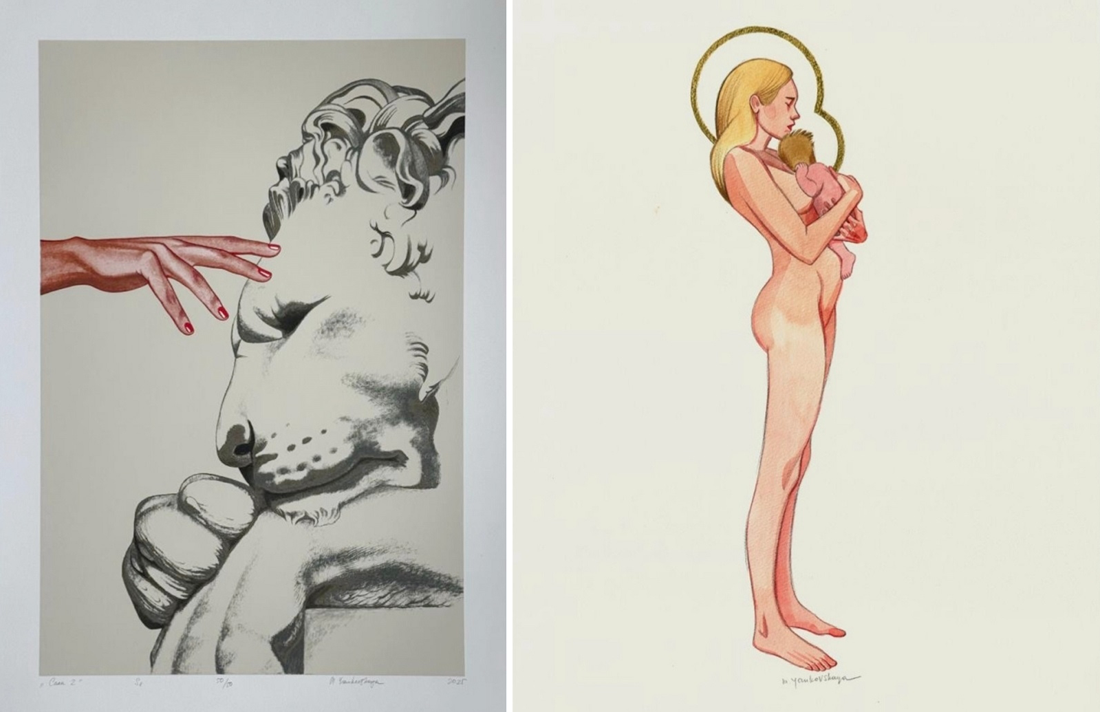 Первую группу работ можно условно назвать «женщина-Лилит» — резкая, властная, соблазняющая и язвительная. Раннее полотно «Встреча» (2016) изображает угловатую, яркую героиню в демонстративно-решительной позе. Она стремится к доминированию, хочет овладевать, но одновременно отталкивает. В серии «Прохладный эротизм» та же натура провоцирует, использует, выделывается — ей смешно. В картинах «Это любовь» и «Это любовь 2» художница уходит за кадр, оставляя лишь красные розы, протыкающие живую плоть. Это образ натянутого нерва: больно было неизбежно, и эту боль причиняют не только мужчине, но и себе. Героиня беспощадна, режет по живому, но умеет терпеть и знает ради чего. Еще одна работа — «Василиса»: женщина оглядывается назад, ее сила разрушительна, готова спалить прошлое и собственные тени. Она боится своей мощи, прикрывает глаз, чтобы не видеть, но все равно ставит на зеро — ради самого опыта. Такая Лилит у Янковской мощная, яростная, стремительная, сексуальная. Ей не нужно заигрывать с публикой, она просто есть — и она большая. Ее темная сторона живет в каждой женщине, иногда спит, но откликается при взгляде на эти холсты.