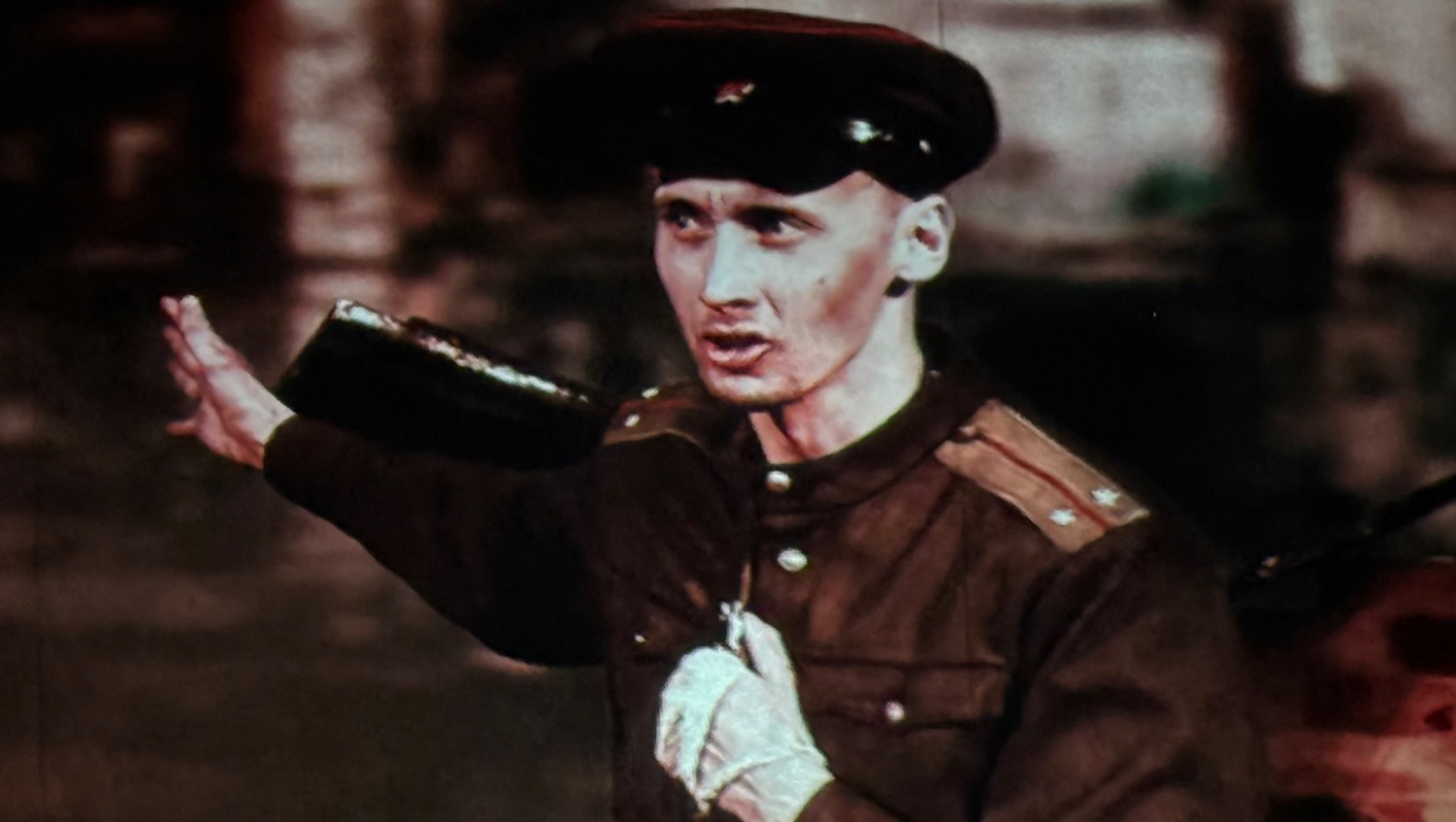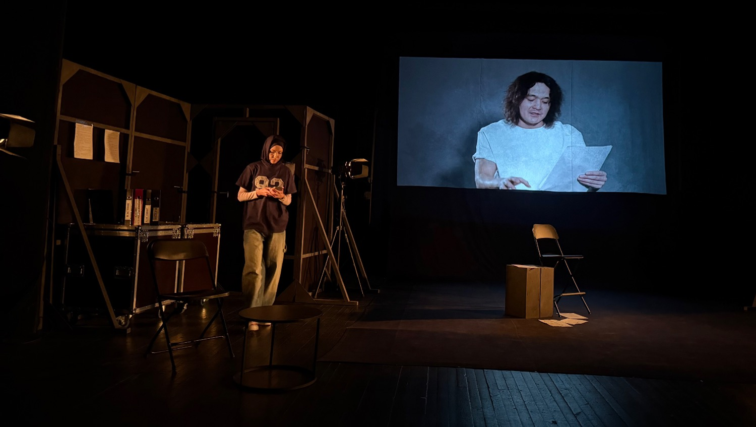 На условной Камерной сцене выстроена площадка киностудии. На экране задника мелькают кадры кастинга с одними и теми же кусками монолога. Идет отбор на роль главного героя для фильма о Великой Отечественной.