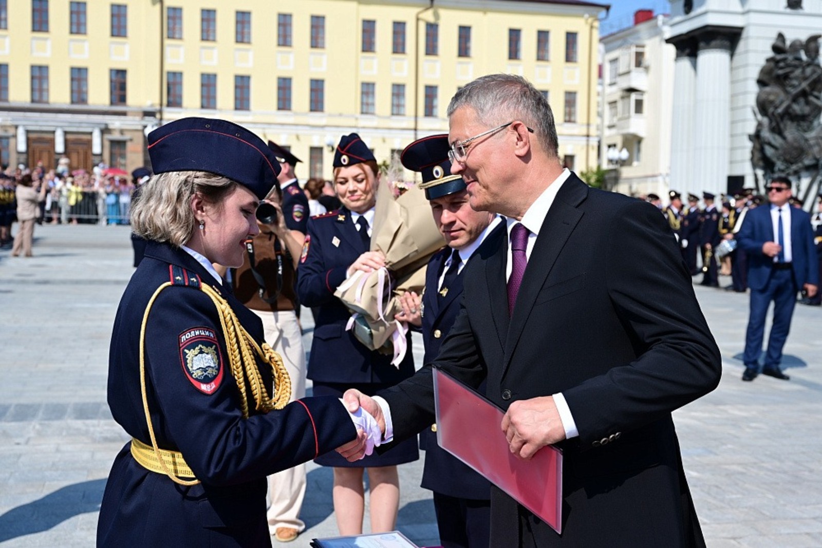 В рамках мероприятия Радий Хабиров возложил цветы к памятнику Героя России Минигали Шаймуратова и вручил почётную грамоту полковнику полиции Елене Кулеш за профессиональные достижения.