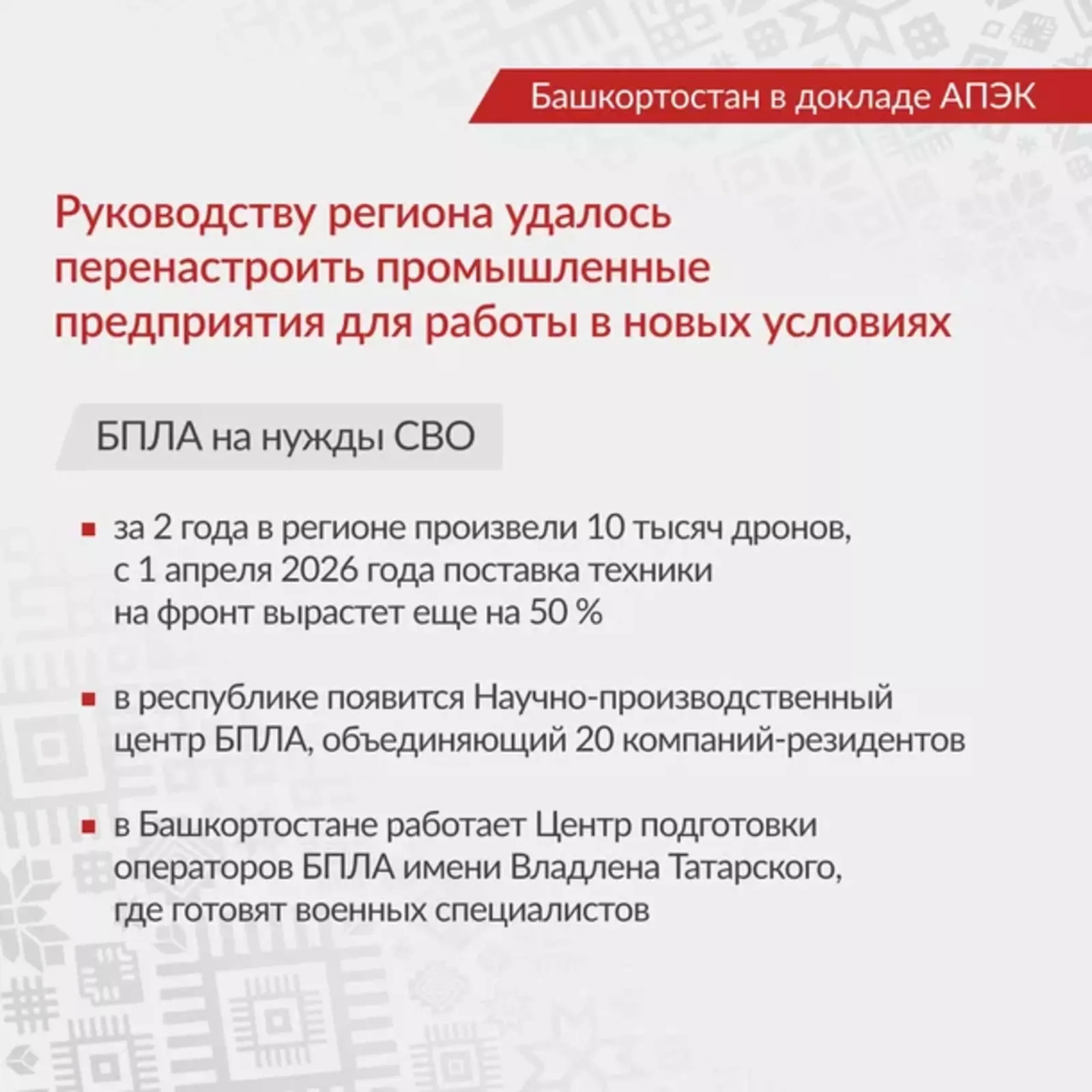 - ОПК и БПЛА: Создан мощный кластер по производству беспилотников (включая тяжелый дрон «Ҡыш Бабай»), объемы выпуска электромоторов для БАС исчисляются сотнями тысяч. В 2026 году анонсирован запуск Научно-производственного центра БПЛА, объединяющего 20 компаний.