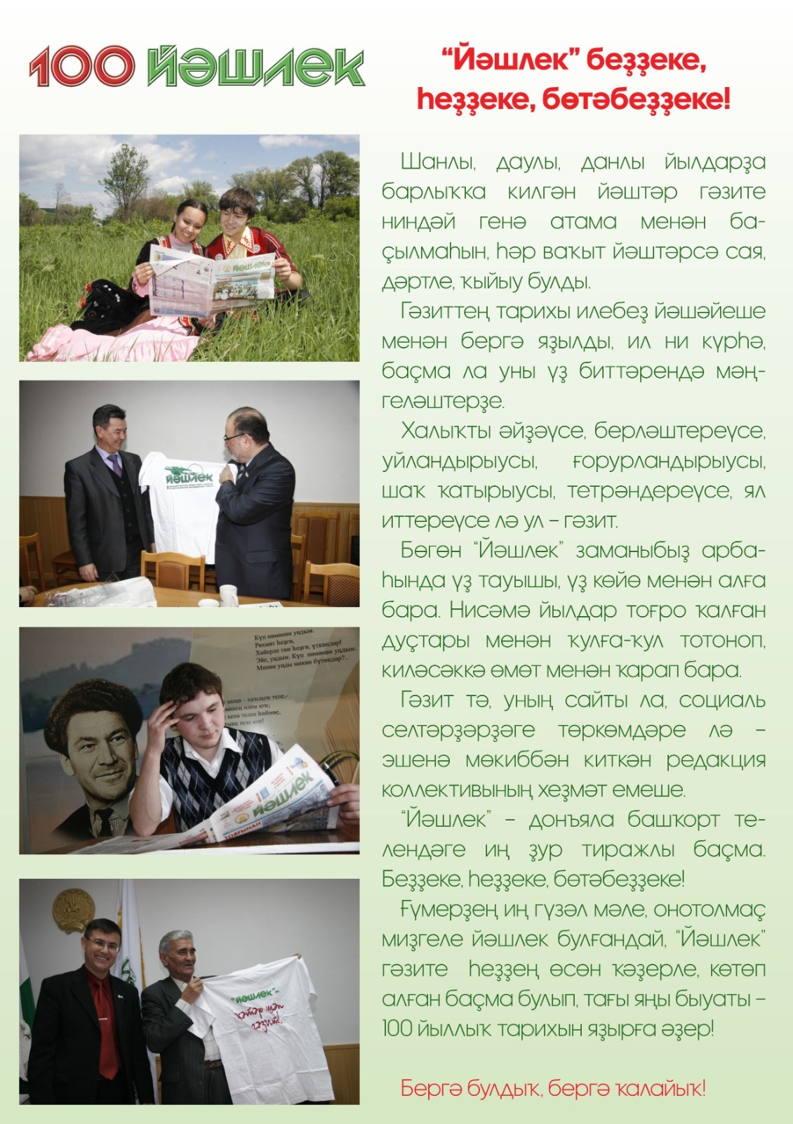 В этом году "Молодежной газете" исполнилось 100 лет! Первый номер регулярно издающейся молодёжной газеты Башкирии «Йэш юксыл» («Юный пролетариат») вышел 12 января 1923 года. С тех пор названия издания несколько раз менялись, а с 1996 года закрепилось имя "Молодежная газета".