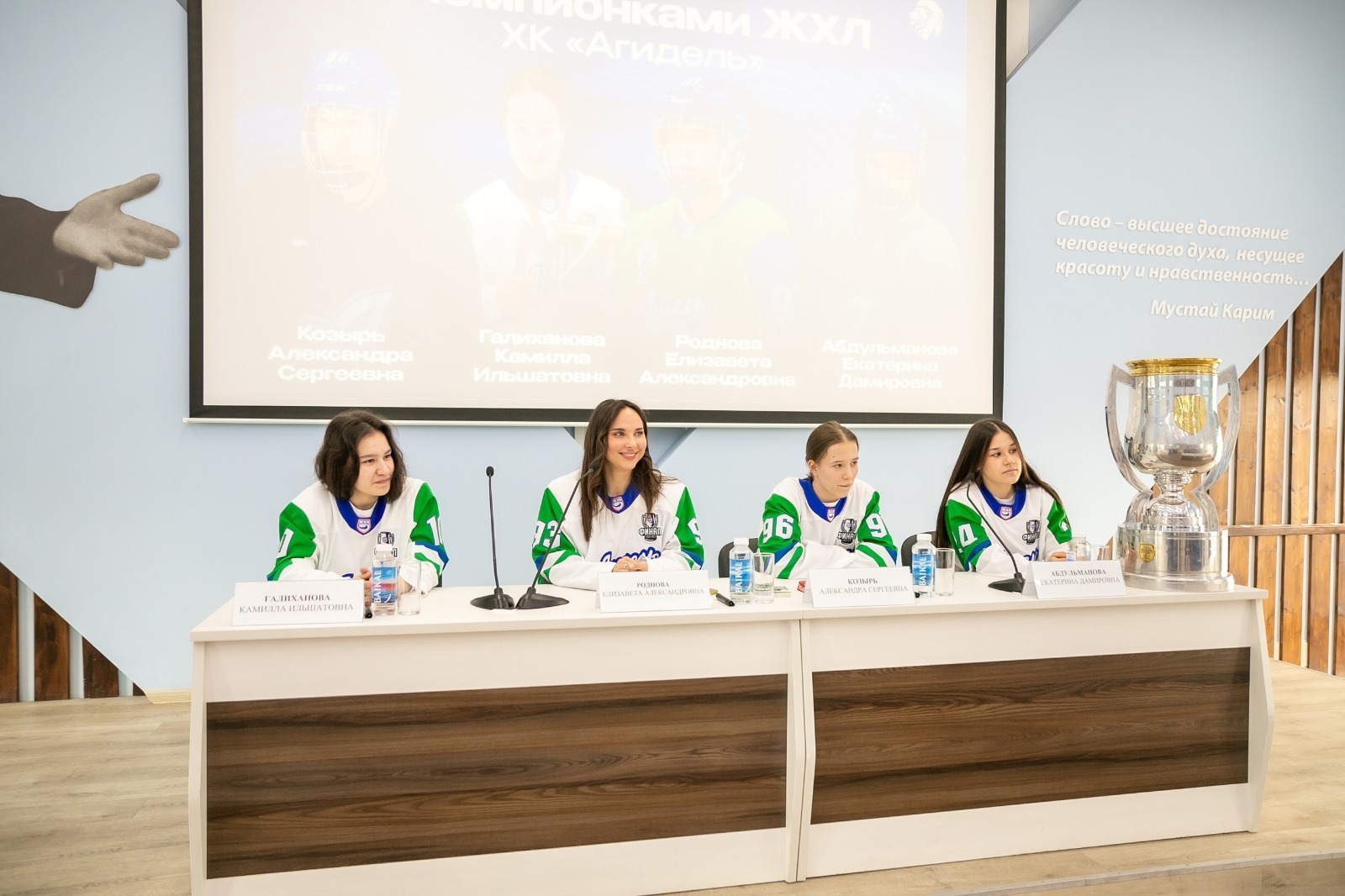 На днях «Агидель» обыграла петербургский клуб «Динамо-Нева» в четвертом матче финальной серии Женской хоккейной лиги и стала победителем турнира. Чтобы пообщаться с выдающимися спортсменками — Александрой Козырь, Камиллой Галихановой, Елизаветой Родновой и Екатериной Абдульмановой, на встречу пришли десятки студентов. Каждому из них хотелось задать вопрос нашим героиням.