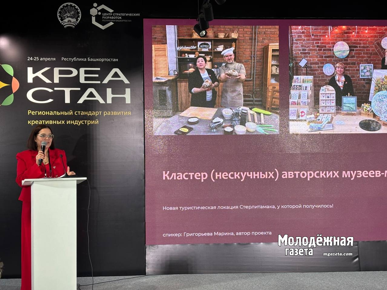 Следующей выступила Марина Григорьева – со-основатель проекта «Ремесленный шоколад из Башкирии», автор музея-мастерской шоколада, кластера авторских музеев ПАТРИКИ-маркет. Девушка презентовала кластер авторских музеев-мастерских «Культурный код» в Стерлитамаке. Это объединение четырех брендов: музей-мастерская ремесленного шоколада «Ремесленный шоколад из Башкирии», музей-мастерская ремесленного хлеба на закваске «Хлебмастер», галерея локальной живописи «Шиханы и Стерлитамак».
