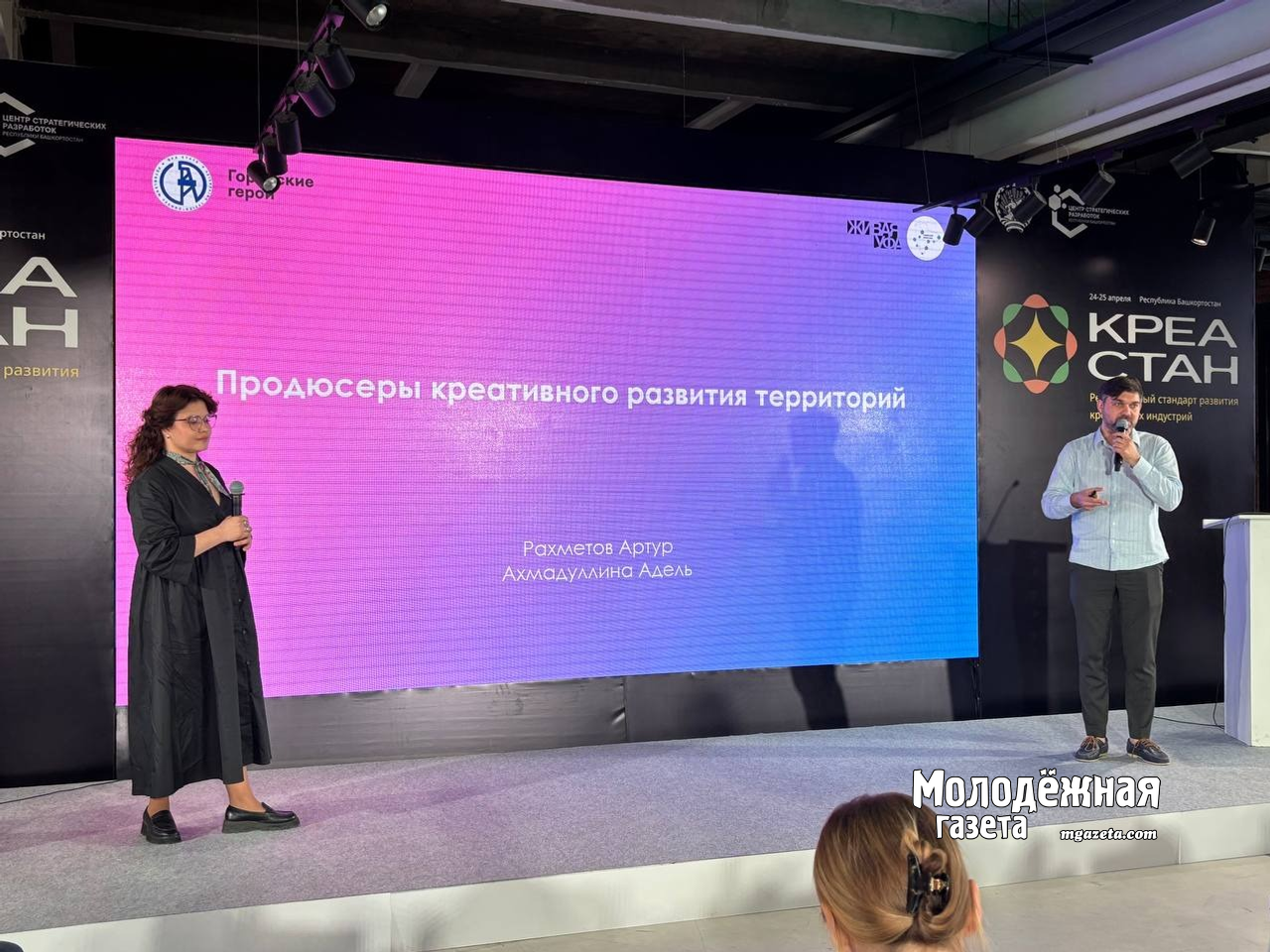 Артур Рахметов, учредитель и руководитель проектов АНО РПИ «Территория развития креативных индустрий города Агидель», председатель Фонда «Живая Уфа» и Адель Ахмадуллина , директор АНО Центр развития территорий «Уфимское ожерелье», сооснователь архитектурного бюро «Ахмадуллин-Аркитектс» представили проекты Лаборатория «Креативные пространства университета» и «Школа креативных продюсеров территорий».