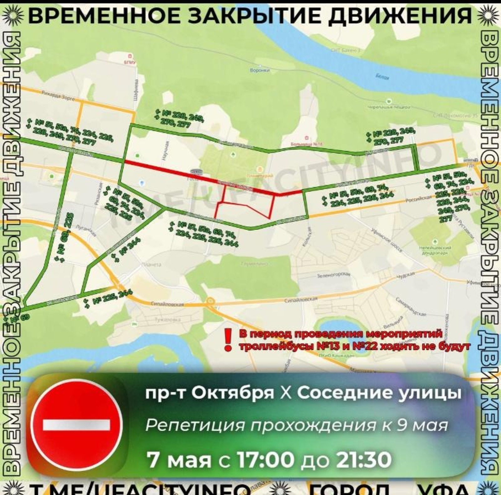 4 мая с 17:00 до 21:30 перекроют проспект Октября от Южного проезда до улицы Кольской, а также Северный проезд от проспекта Октября до улицы Новогорной. 7 мая в те же часы ограничения коснутся большего участка: проспекта Октября от улицы Шафиева до Кольской, Южного и Северного проездов от проспекта Октября до улицы Российской, а также улицы Новогорной между Южным и Северным проездами.