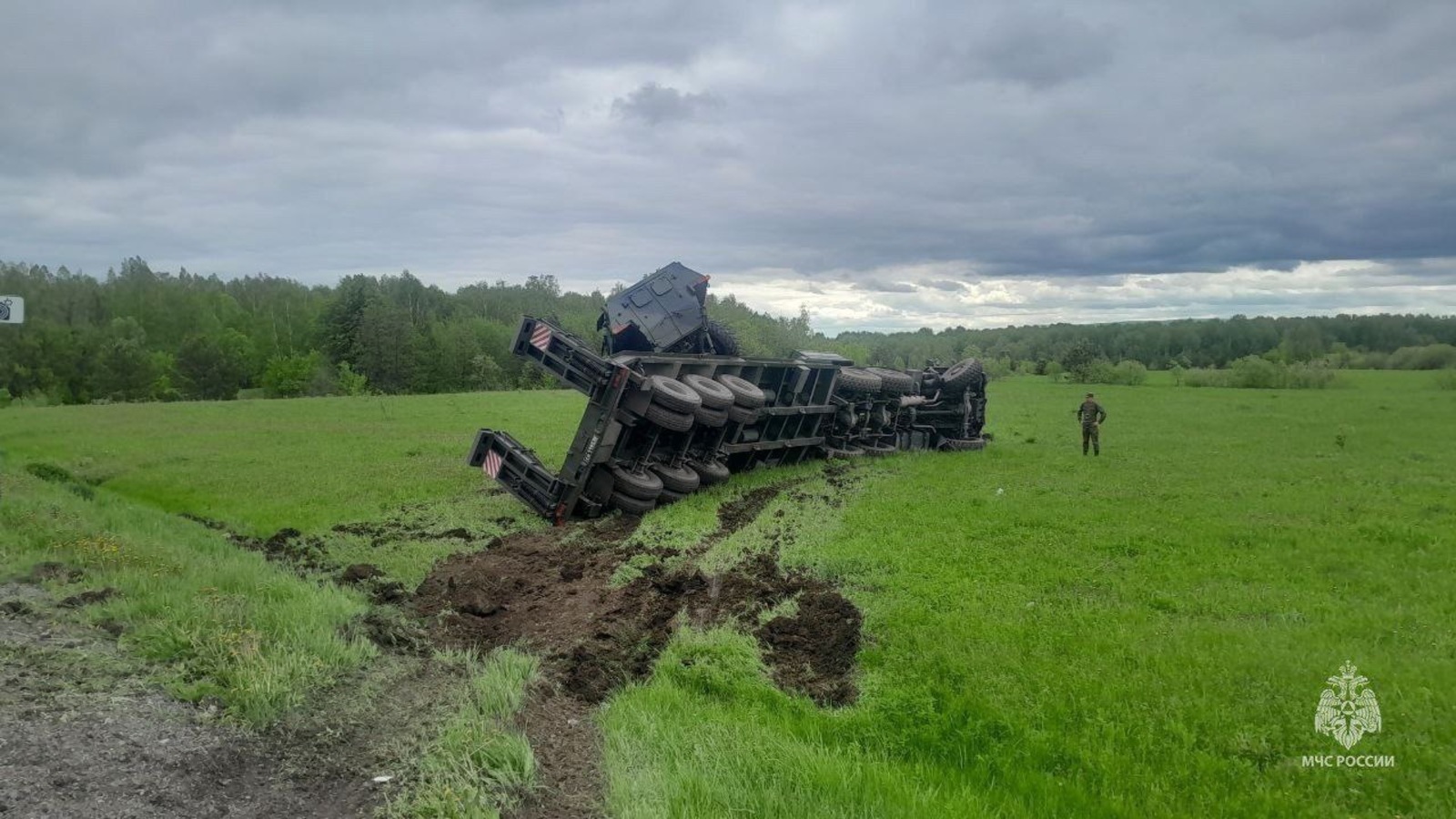 В результате ДТП грузовик съехал в кювет и опрокинулся на бок. Для его поднятия потребуется привлечение автокрана.