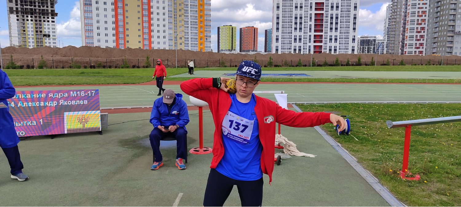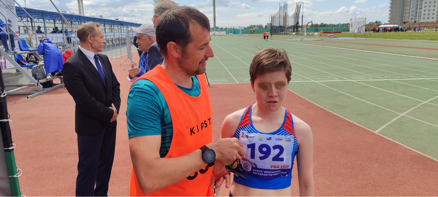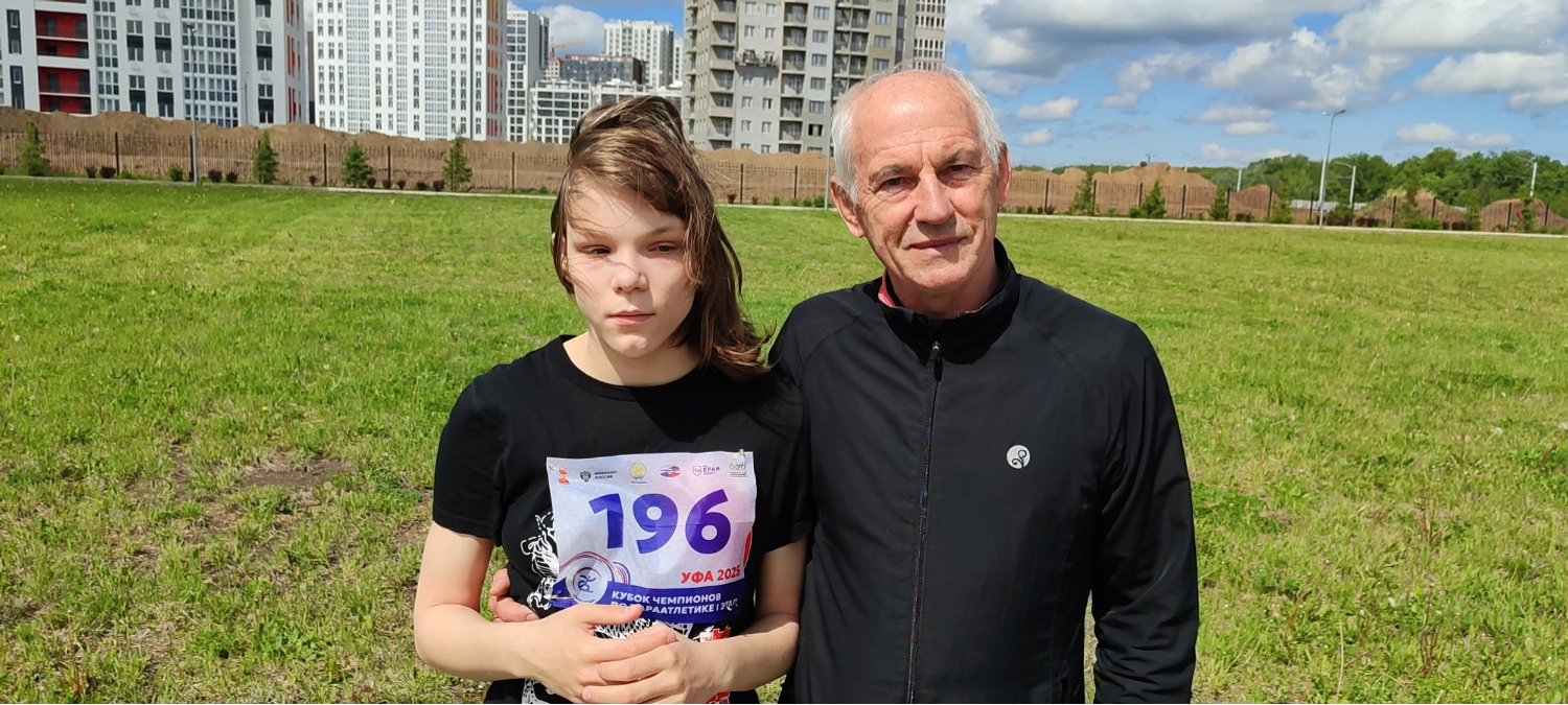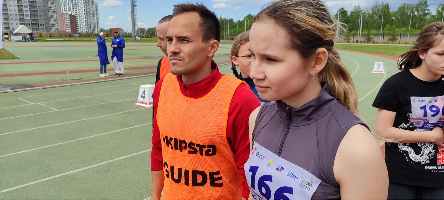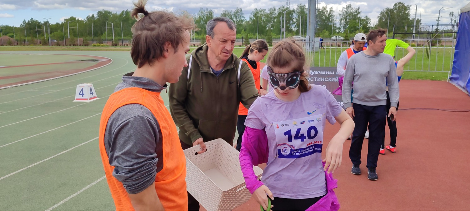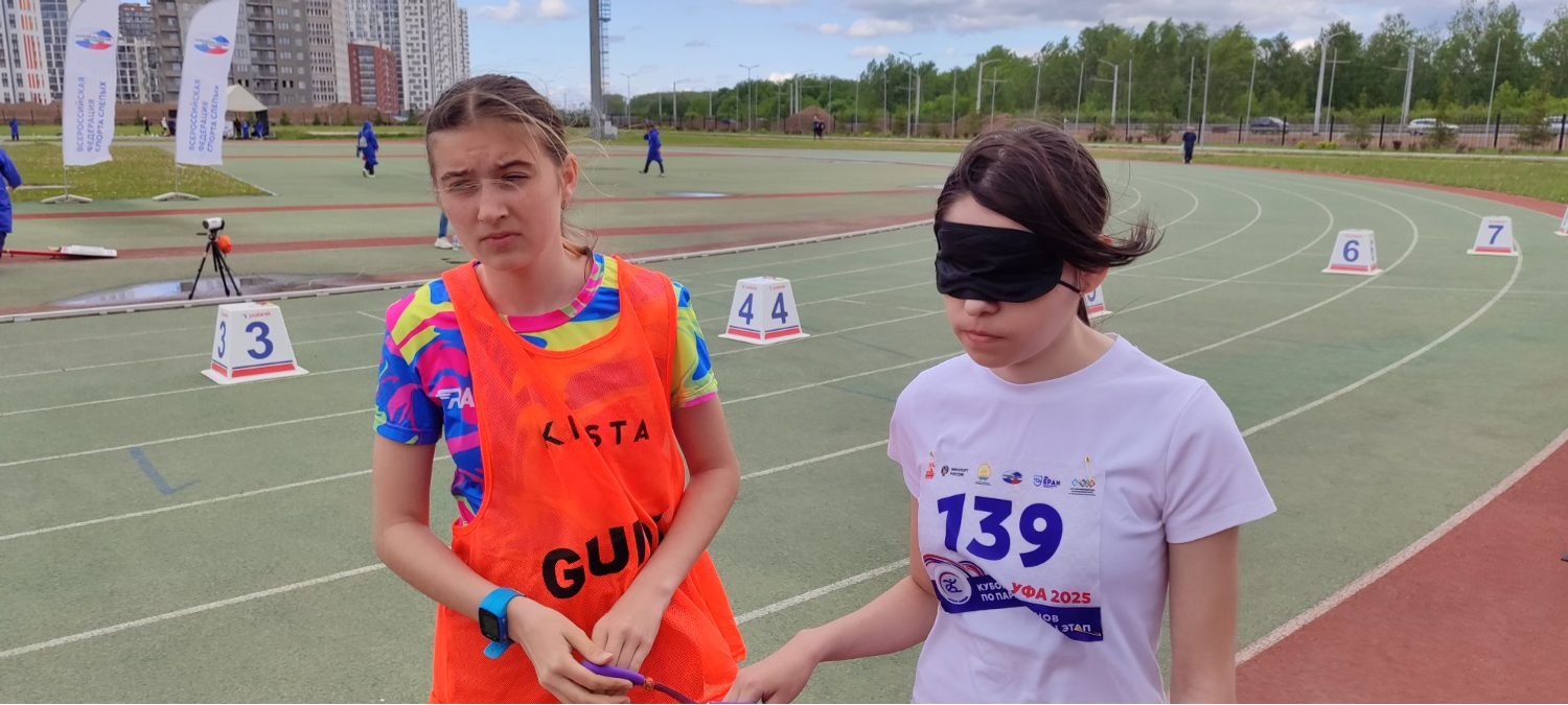 Ирина Игнатьева, 15 лет, приехала из Екатеринбурга. Чтобы попасть в Уфу Ирина прошла много соревнований по бегу. Она в прошлом году была чемпионкой России на 1500 метров. В Уфе хочет попробовать себя в толкании ядра. Рядом тренер Виктор Манский – он добился высоких результатов в тренировке детей с ограничениям зрения.