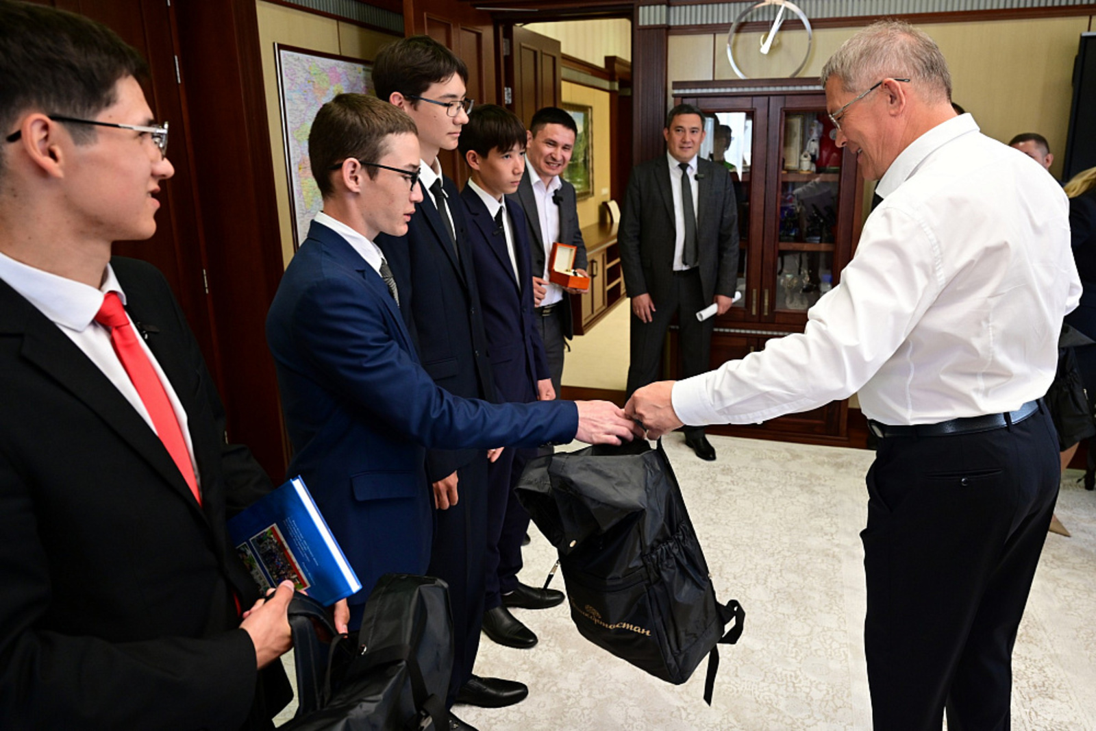 Четверо учащихся – Аскар Галимуллин, Арслан Ишкильдин, Ильнур Салихкулов и Алмаз Тагиров – смогли не только осмотреть кабинет руководителя республики, но и побывать в залах для совещаний. Особое впечатление на ребят произвела картина «Молись, брат, я прикрою», подаренная Хабирову художником Александром Скорняковым.