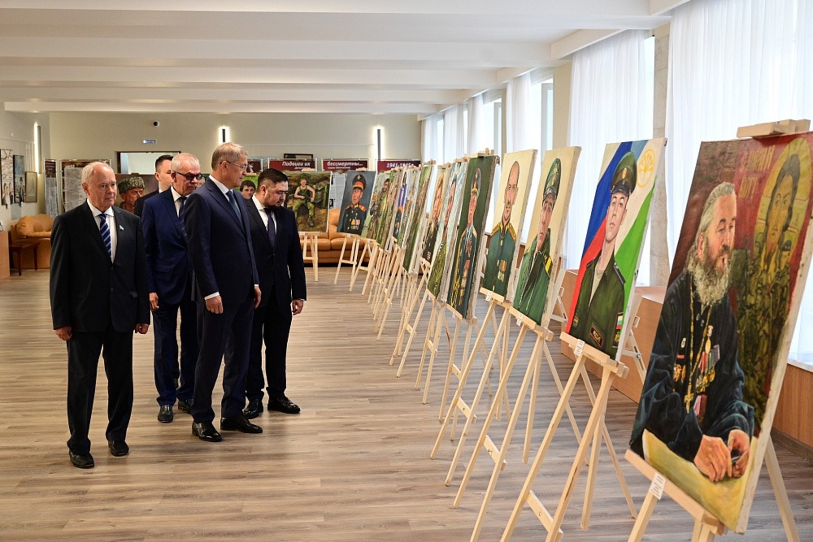 Перед началом мероприятия руководитель региона осмотрел выставку "СВОи Герои", где представлены портреты участников специальной военной операции, включая 15 Героев России и трех кавалеров ордена Мужества, восемь из которых изображают уроженцев республики. Авторы картин – Вера Фролова и Марат Мухаметзянов.