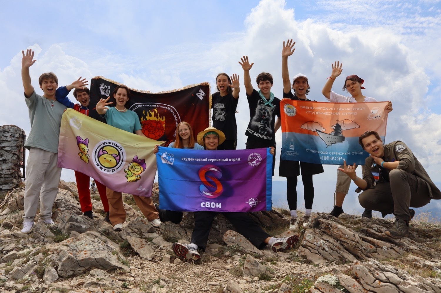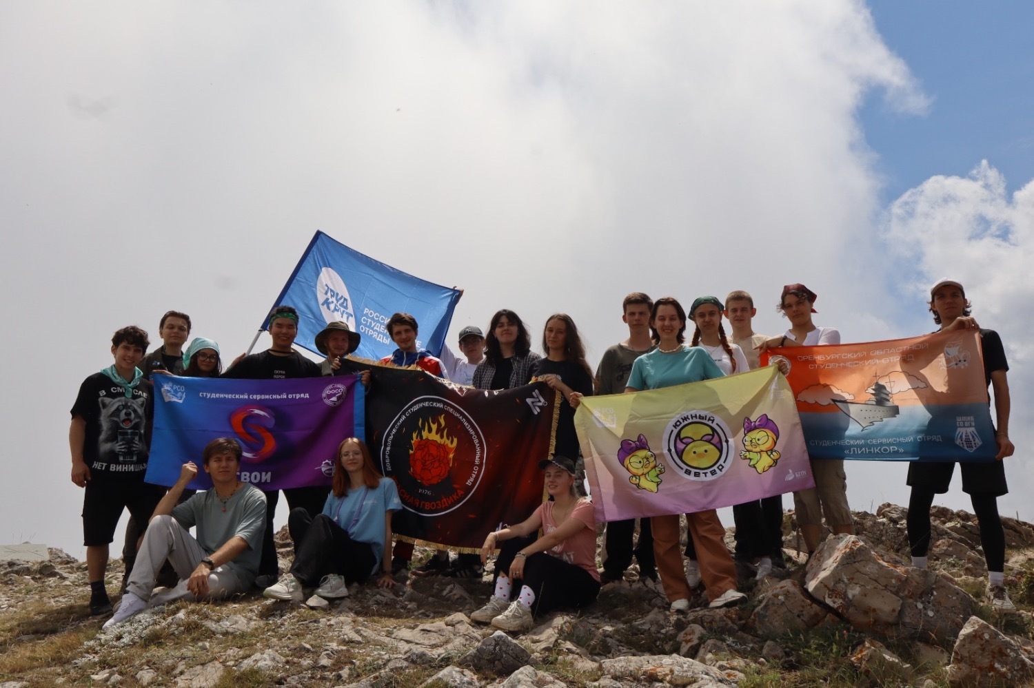 На вершине Эклизи-Бурун бойцы водрузили флаги РСО, сервисного отряда "Южный ветер" и других студенческих отрядов.