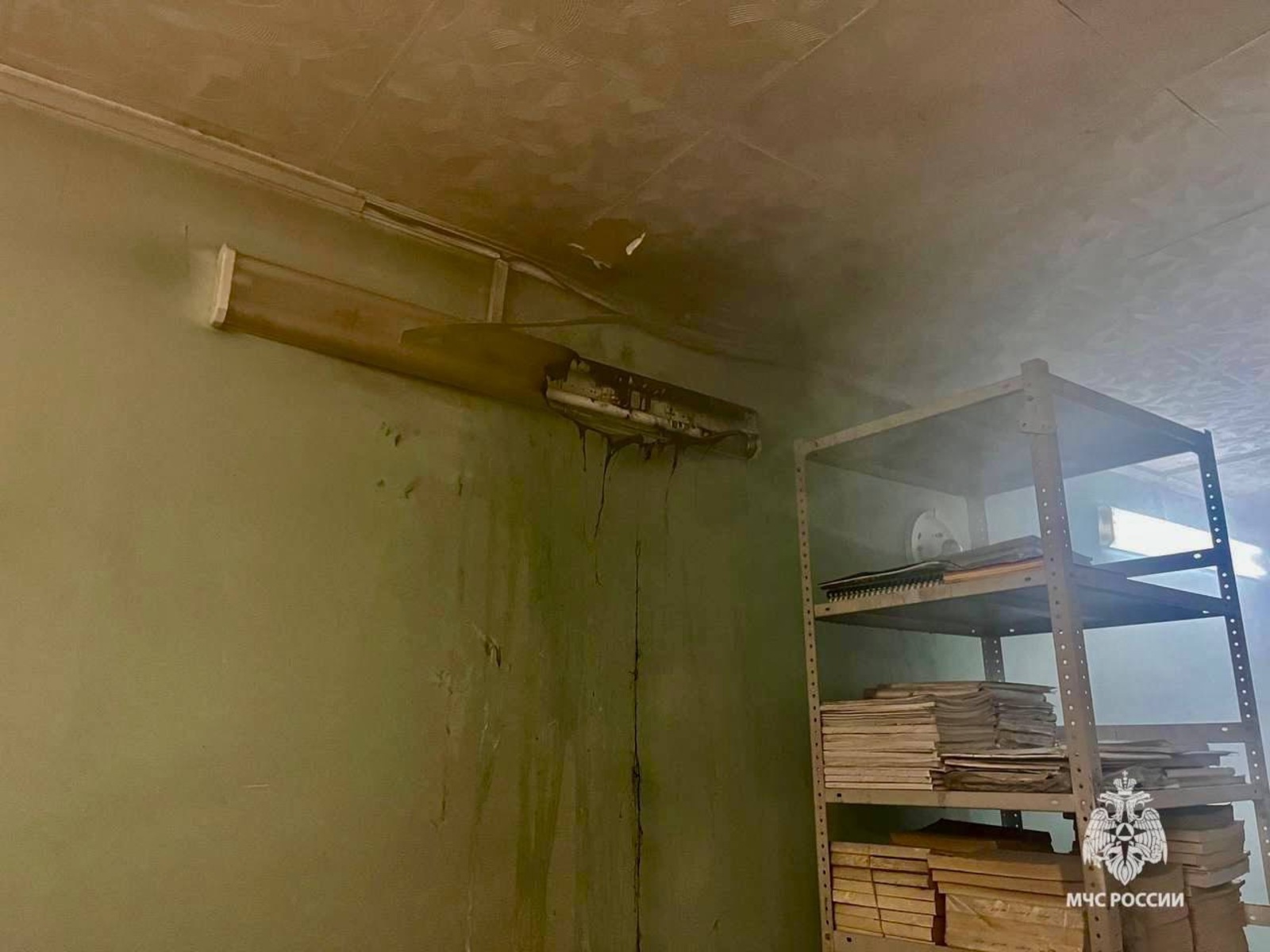 Источником задымления стал перегоревший светильник в подсобном помещении. Несколько книг получили повреждения.