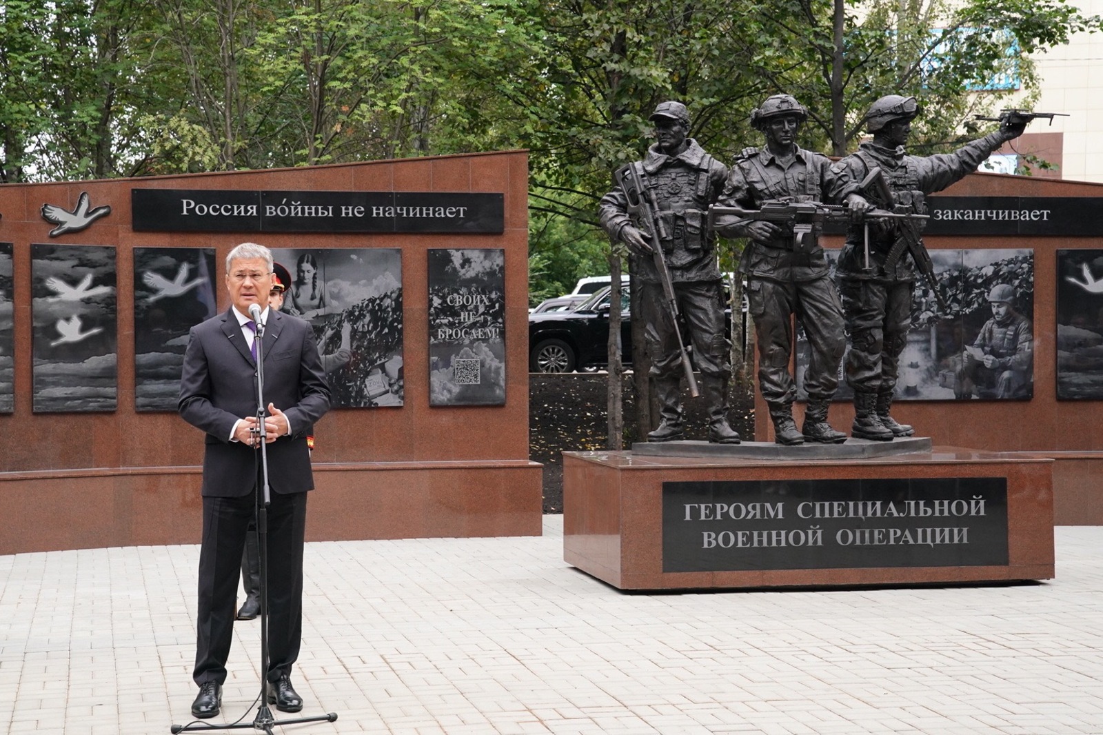 Радий Хабиров отметил, что мемориал создан как дань памяти погибшим героям и символ поддержки действующим военнослужащим: