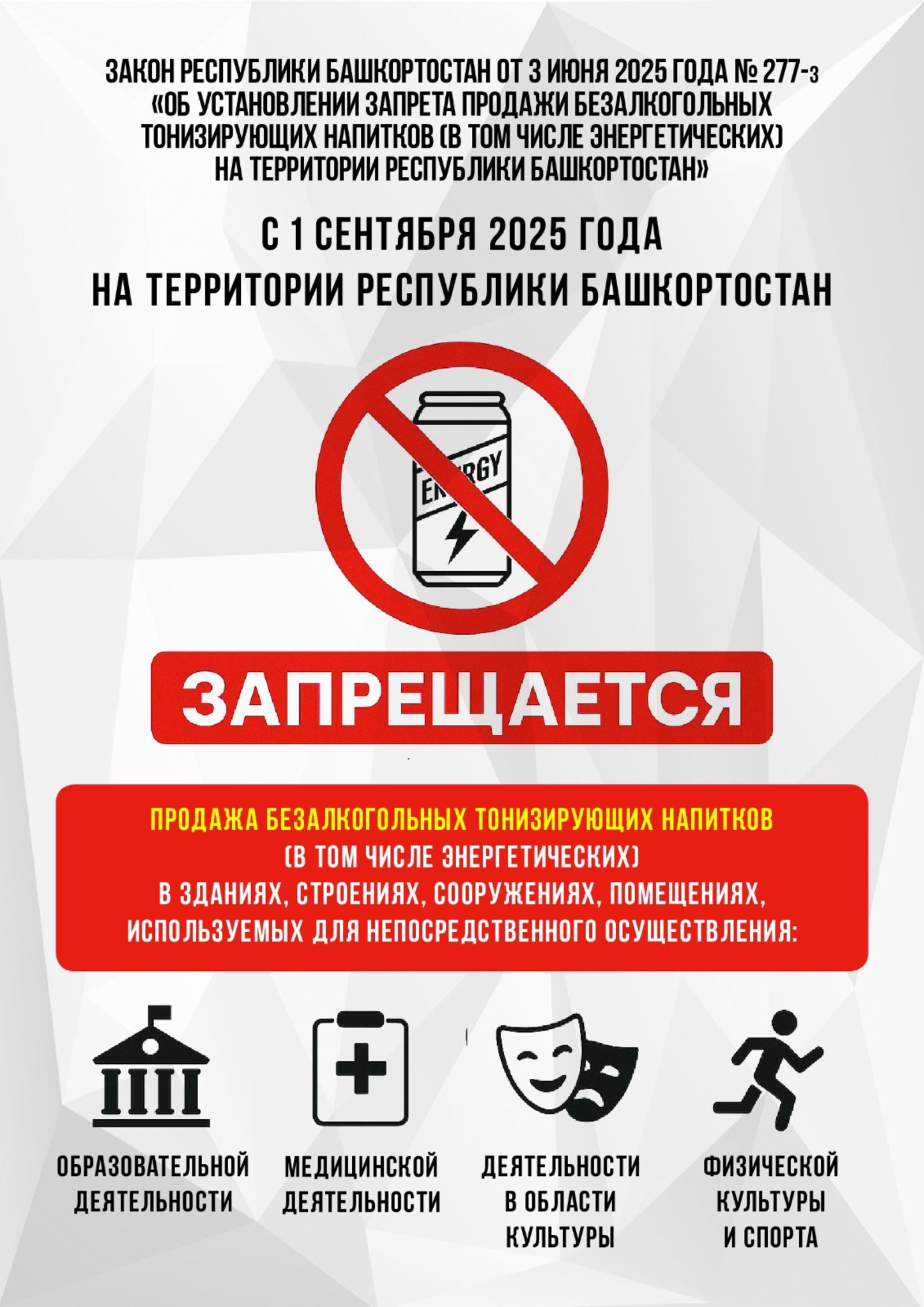 Под ограничение попадают школы, вузы, больницы, театры и спорткомплексы. Запрет касается напитков с добавленными стимуляторами, такими как кофеин, гуарана, женьшень и лимонник, в количестве, обеспечивающем тонизирующий эффект.
