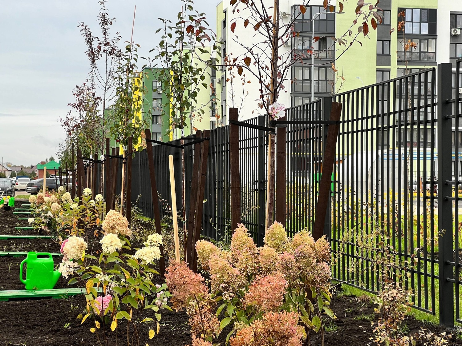На территории высадили 35 крупных саженцев: мелколистные липы и декоративные яблони сортов «Мокум», «Роялти» и «Рудольф». Яркие краски клумб дополнили сортовые гортензии и спиреи. Установленный арт-объект с надписью «Яблоневый цвет», стал символическим акцентом новой зелёной зоны.