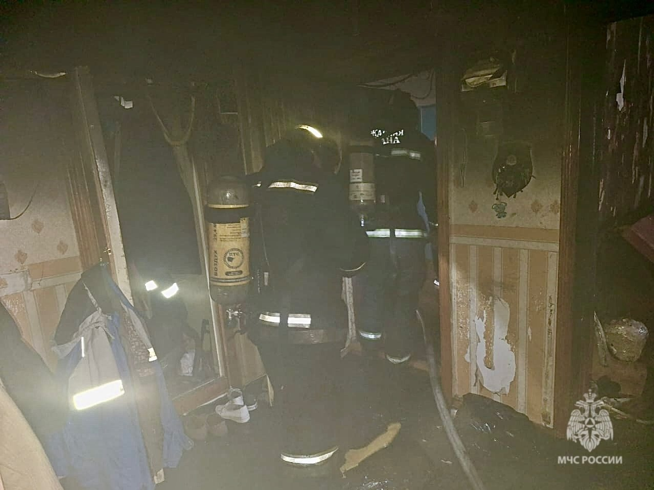 Пожарные, прибывшие по вызову, незамедлительно приступили к тушению и поисково-спасательным работам. В задымлённом помещении были обнаружены двое человек, которых удалось благополучно вывести на улицу с применением маски спасаемого.
