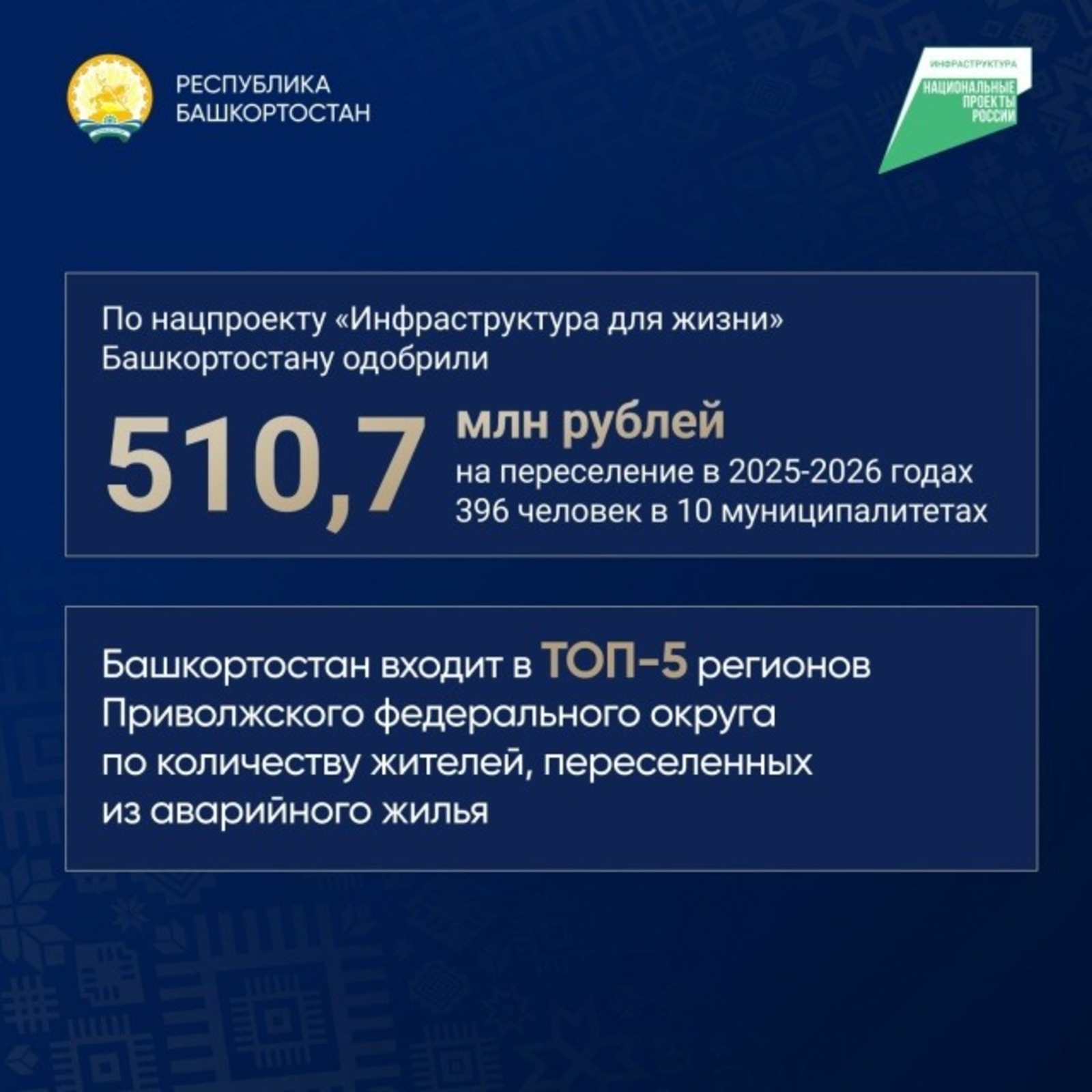До конца 2026 года в Башкирии планируют переселить 396 жителей 10 городов и районов из аварийных помещений общей площадью 7,9 тыс. квадратных метров. Это произойдёт в рамках нового этапа программы по расселению аварийного жилья, на который Башкортостан получит из федерального бюджета более 510 млн рублей в рамках нацпроекта «Инфраструктура для жизни». В новый этап вошли дома, признанные аварийными в 2017–2022 годах.