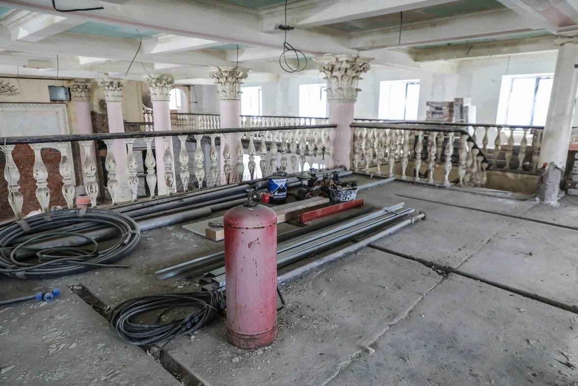 Объект обладает статусом культурного наследия, что накладывает особые требования к проведению работ. В связи с этим в настоящее время ведется корректировка проектно-сметной документации по отдельным направлениям. Там, где это не противоречит утвержденному проекту, ремонтные работы продолжаются: полностью отреставрированы кровля и фасад, восстановлены капители колонн, пилястры и лепнина, установлены новые оконные блоки. Параллельно ведется внутреннее обустройство — монтаж металлического каркаса сцены, устройство подиума зрительного зала, армирование и бетонирование лестничных ступеней.