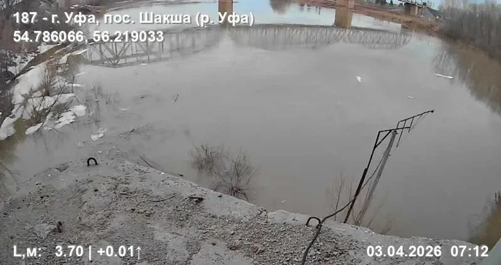 - на реке Уфе у поселка Шакша ГО г.Уфа, динамика уровня воды за сутки +69 см, текущий уровень 434 см, выход реки на пойму 830 см;