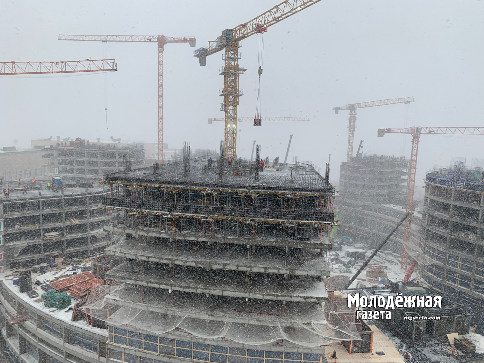 Сейчас на стройке ежедневно работают более тысячи человек. Семь башен возводятся одновременно со скоростью 3 этажа в месяц. На нижних этажах уже ведется остекление, монтаж инженерных сетей и отделка. На кровле установят солнечные панели для энергоэффективности.